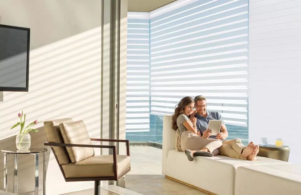 由一小片一小片宽度相等的面料和纱布相互间隔织成的一种纺织物,通过一端固定,另一端随轴卷动的而达到调节光线的目。当纱布和纱布重合时光线比较柔和,一定程度上减少光的直射。当帘布和帘布重合时,光线完全遮住,从而最终达到遮挡光线的目的。