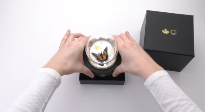 据加拿大皇家铸币厂介绍,这枚3D玻璃蝴蝶产自意大利穆拉诺。“这里的玻璃大师们秉承着数百年历史的工艺,打造出穆拉诺玻璃闻名遐迩的色彩和精湛的工艺。”