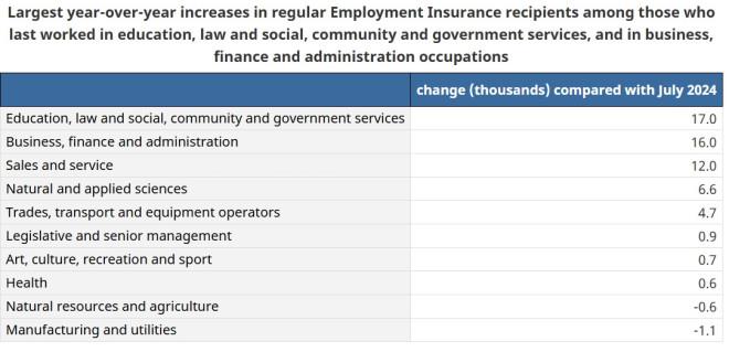 与2024年7月相比,今年7月多个职业类别的常规EI受益人数都有所增加: