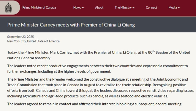 加拿大总理马克·卡尼(Mark Carney)于9月23日在第80届联合国大会期间会见了中国国务院总理李强。