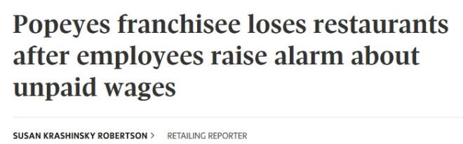 汉堡王、Tim Hortons、Popeyes的母公司Restaurant Brands International Inc.(RBI)已终止与一名拥有13家Popeyes炸鸡分店特许经营商的合作关系,此前有员工指控其拖欠工资。