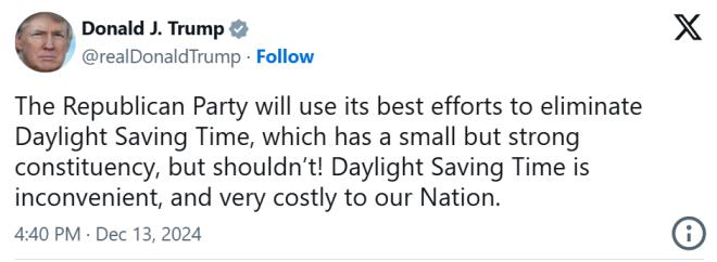2024年12月,美国总统川普在X平台发文表示,他的政党将尽力废除夏令时,称其“麻烦”且“代价高昂”。