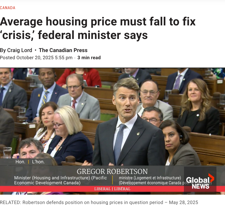 保守党议员亚伦·冈恩(Aaron Gunn)询问住房部长,他是否仍然认为加拿大的房价不需要下跌,并引用了罗伯逊(Robertson)在5月宣誓就任内阁成员后发表的言论。
