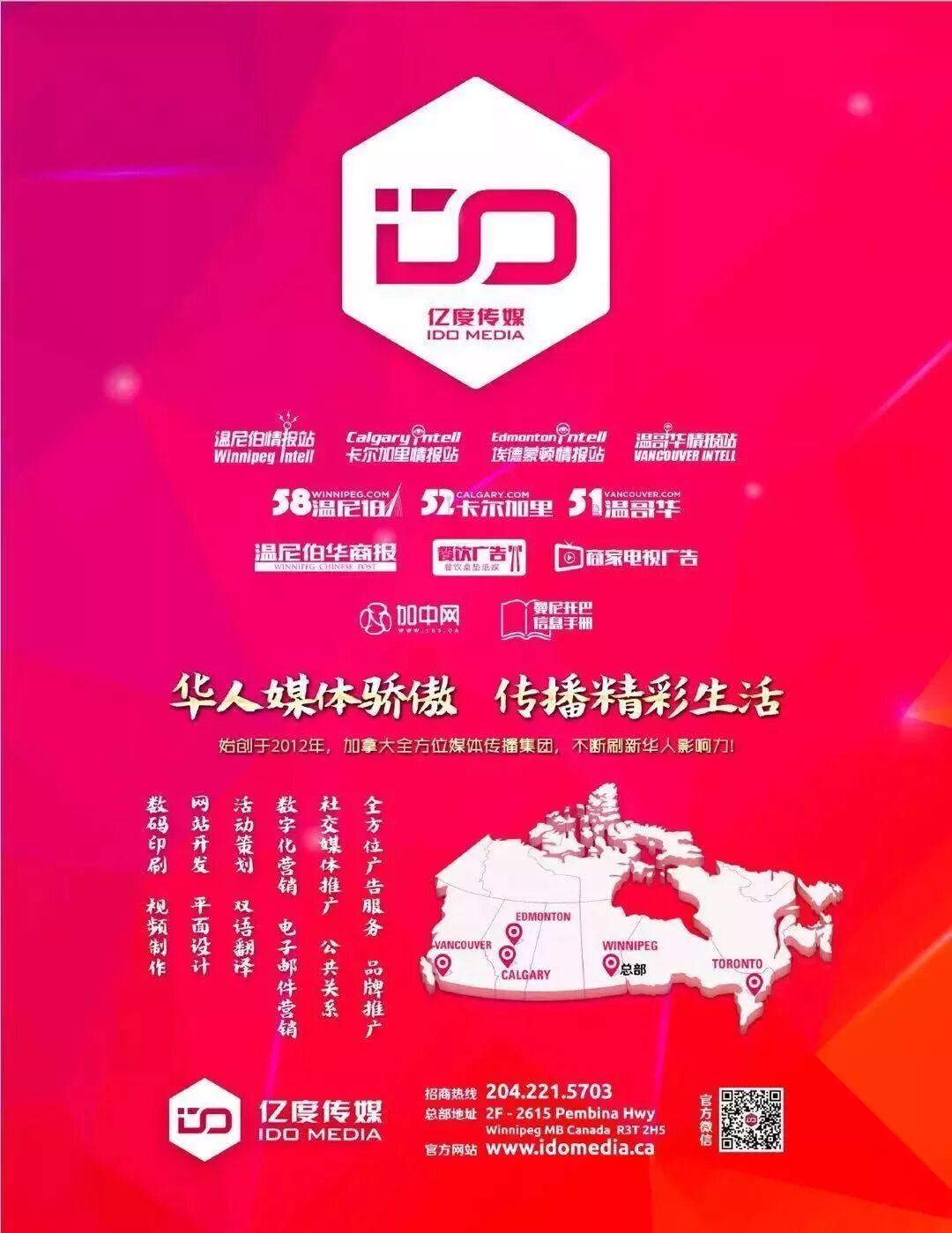 亿度传媒是一家全方位的数字化传媒公司,总部设于温尼伯,已在卡尔加里、温哥华、埃德蒙顿等地成功设立分公司。